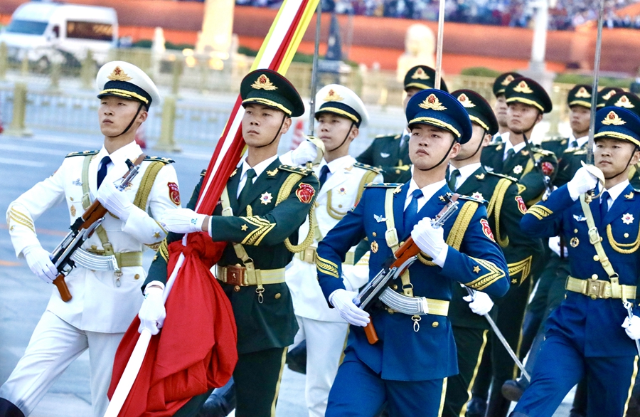 10月1日清晨,中国人民解放军仪仗队执行升国旗仪式。