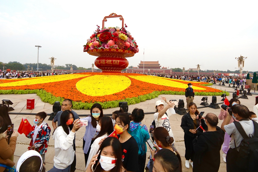 10月1日晨,在北京天安门广场,游客参加国庆升旗仪式。