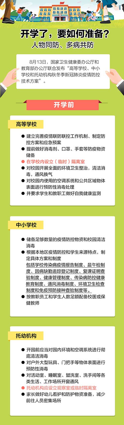 为科学指导高等学校、中小学校和托幼机构做好秋冬季新冠肺炎疫情防控工作,有序推进秋季学期复学复课,国家卫生健康委办公厅和教育部办公厅8月13日联合发布“高等学校、中小学校和托幼机构秋冬季新冠肺炎疫情防控技术方案”。秋季开学要准备些什么?开学后要做些什么?返校学生需要什么条件?今天香柏世家儿童家具十大品牌--艾尚佳缘分享文图让您秒读懂……