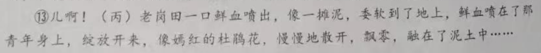 作者这么写的:“一口鲜血喷出,像一滩泥,委软到了地上,鲜血喷在了那青年身上,像嫣红的杜鹃花......”