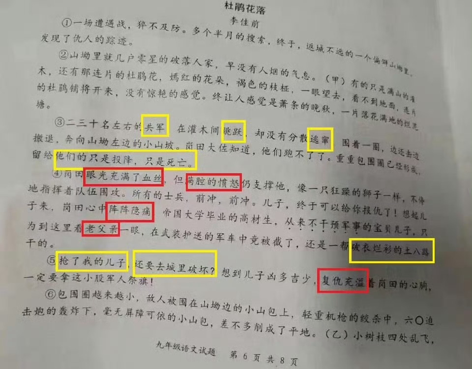 在成都新都区初三年级语文测试中,出现了一篇触目惊心的文章,名叫《杜鹃花落》。看题目,不会觉得有啥。但是,结合文章内容,这“杜鹃花”就另有所指了。