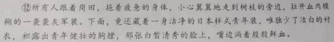 日军是什么形象呢?文章的大佐儿子是这么被描述的:“下面竟还藏着一身洁净的日本样式青年装,唯独少了洁白的衬衣,袒露出青年健壮的胸膛,那张白皙清秀的脸上,嘴边淌着汩汩鲜血。”